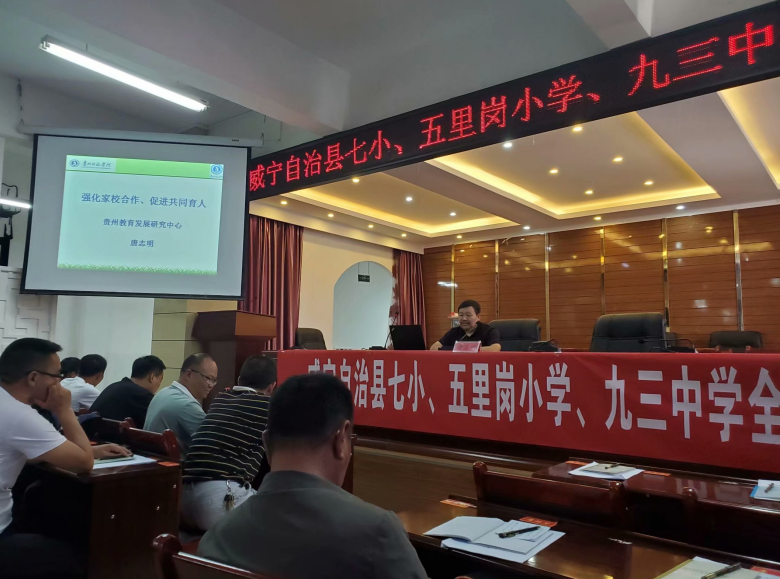 为加强家校合作,促进共同育人,办人民满意的教育,威宁县教育局于2019年8月12日下午举办培训班,来自县七小、五里岗小学和九三中学的全员教师参加了讲座。贵州教育发展研究中心主任唐志明教授应邀作题为“加强家校合作、促进共同育人”的专题讲座。唐教授围绕家校合作的内涵、特点、问题及对策进行了全面深入剖析,并与学员就家校合作的相关问题进行了讨论和交流。